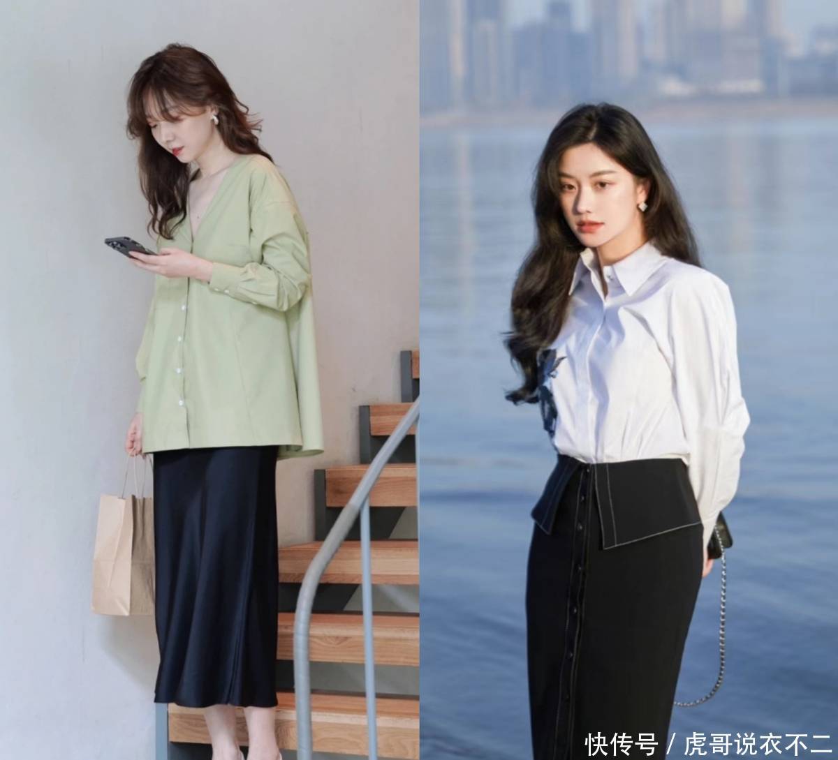 最常见的白色衬衫,有着永不外时的优点,它与玄色半身裙不错交汇出黑与白的视觉对比,属于最极简的一种配色。用宽松少许的裙子,修饰下半身的污点,开释出隆重感。